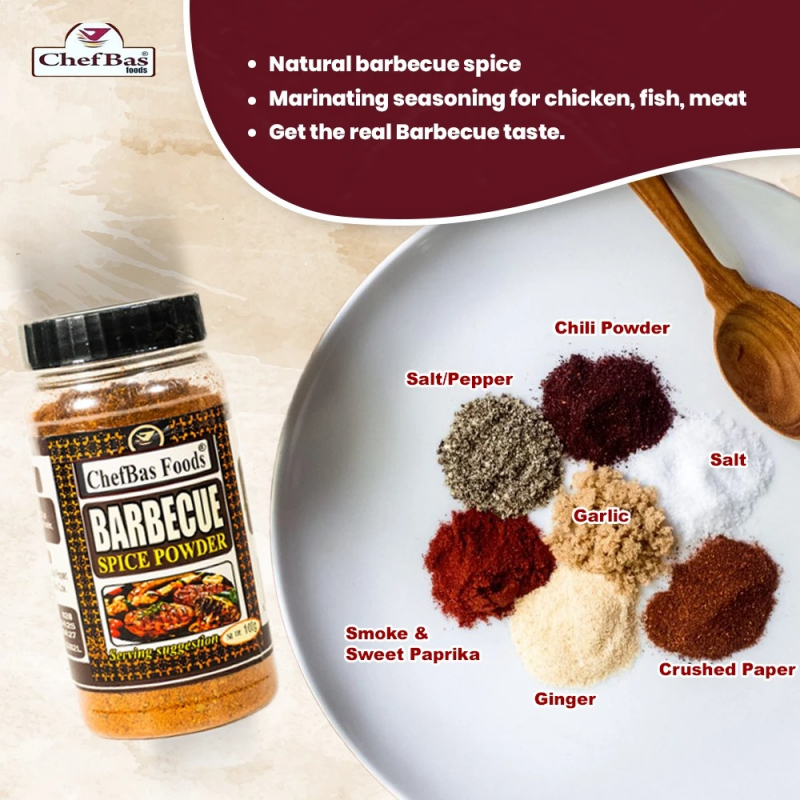 Chefbas BBQ Spice is made from a blend of all natural spice without additive.It gives your Fish, Turkey, Grills that authentic taste you love. It is packed with bold, smoky, and slightly spicy flavor that makes that mouth-watering barbecue.