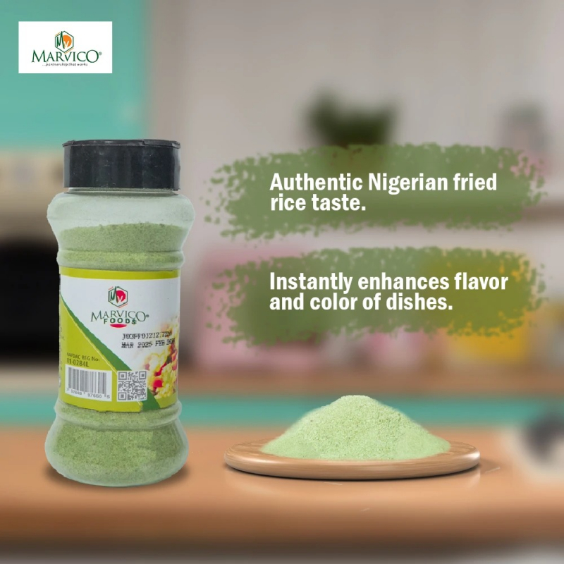 Marvico friedrice seasoning is created with a blend of garlic, thyme, turmeric, green cardamom, corn oil, and salt for a balanced taste. Each jar packs authentic flavor, 100% pure with no artificial additives or preservatives.